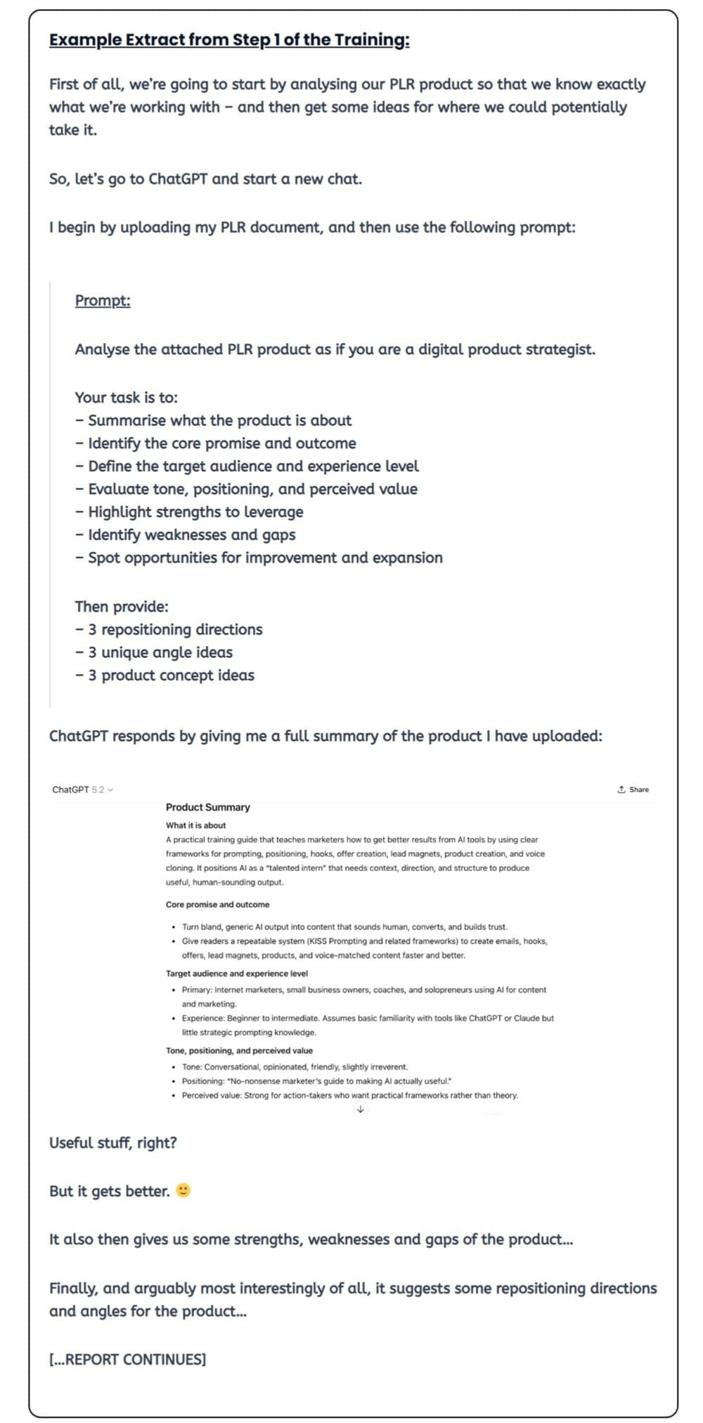 Instead of jumping straight into editing, I used the prompts to have AI analyze the PLR like a product strategist.