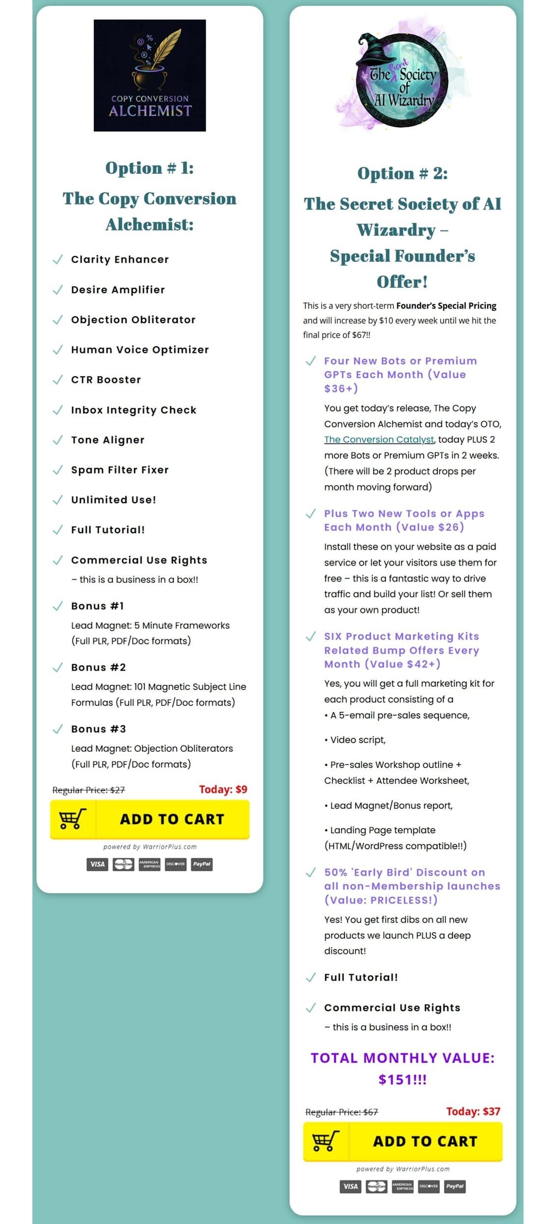 I recently chose The Secret Society of AI Wizardry – Founder’s Membership, and it’s been a game-changer. For $37 a month, I’m not just getting The Copy Conversion Alchemist—I’m unlocking a growing toolkit that keeps expanding with fresh AI-powered GPTs and web tools every single month. This subscription delivers so much value with four new AI bots, two web apps designed for traffic and list-building, plus six complete product marketing kits packed with email sequences, video scripts, lead magnets, landing pages, and more.